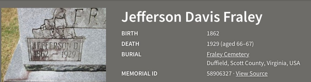 When people express interest, amazement, or just questions about my cultural, national, or political ecclecticism, I can always point to these two not-so-remote ancestors as an excuse. I of course never knew my great-grandfather “Jeff Davis,” as he was called by his friends—named, of course, for the President of the Confederate States of America—who died when his granddaughter, my mother, was a child; but I knew his widow, my great-grandmother Susannah Duncan Fraley very well and, of course, his daughter, my grandmother Dora Fraley Davis.