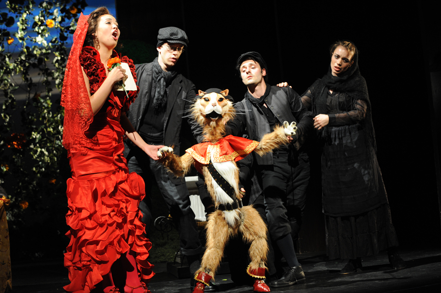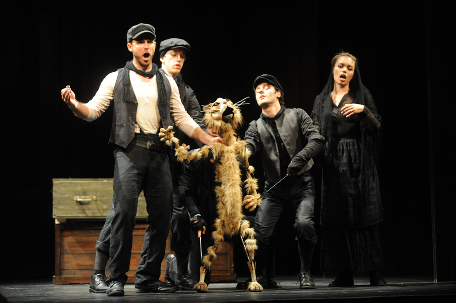 If you want to see a well-made opera performed with a complete dramatic conception fully realized, incorporating theatrical devices that are thoroughly original, appropriate, and entertaining, get yourself to the elegant New Victory Theater this week for the Gotham Chamber Opera‘s production of Xavier Montsalvatge’s El gato con botas. Like Humperdinck’s Hansel und Gretel, it was conceived for adults but delights children; unlike H&G, it’s only one hour long. I am generally anti-puppet, at least in opera, but these figures — and, more especially, the sensitive use of them — more than won me over. And the music itself is above praise.